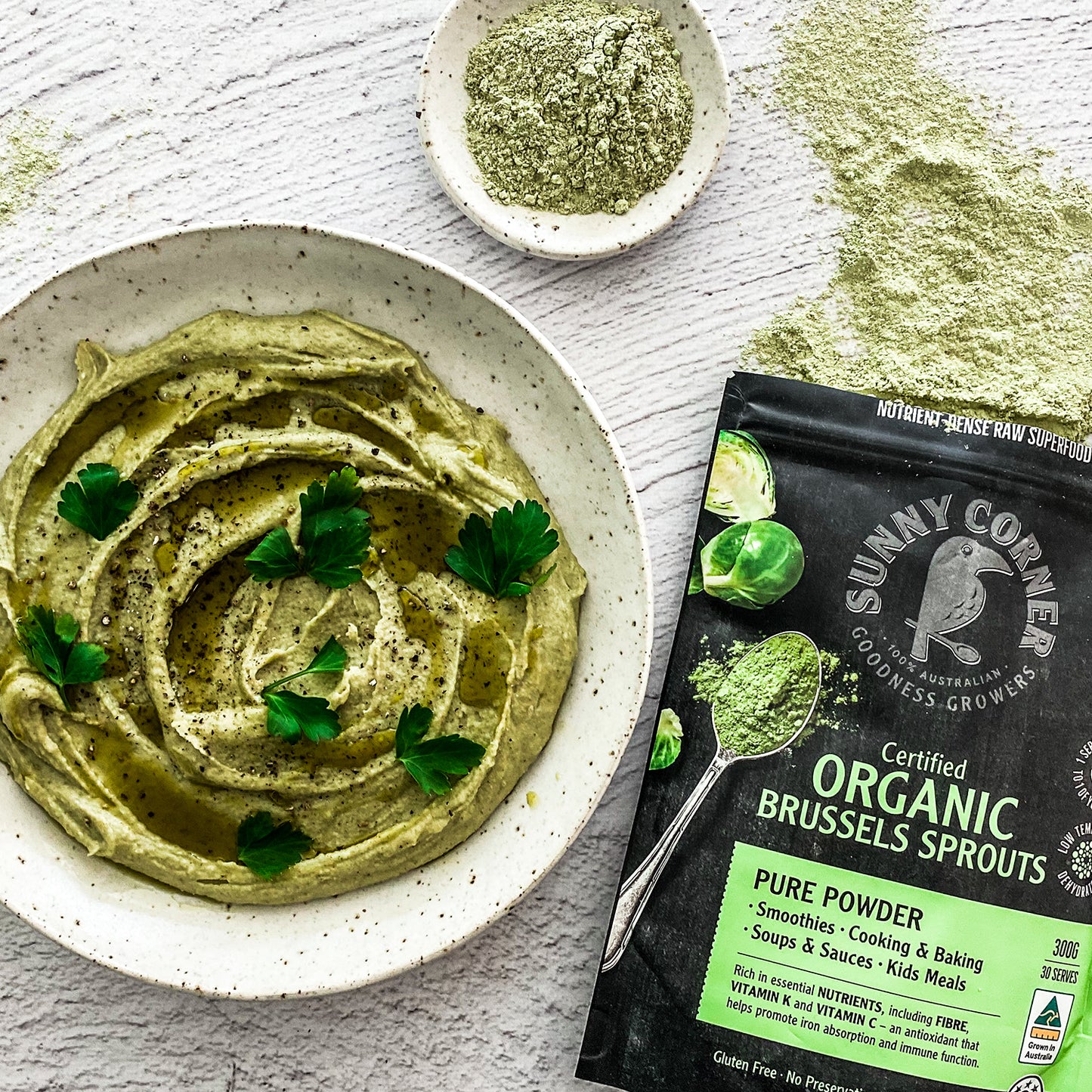 - Place the chickpeas, lemon juice, garlic, Brussels Sprout powder and salt in a food processor and blend until smooth.
