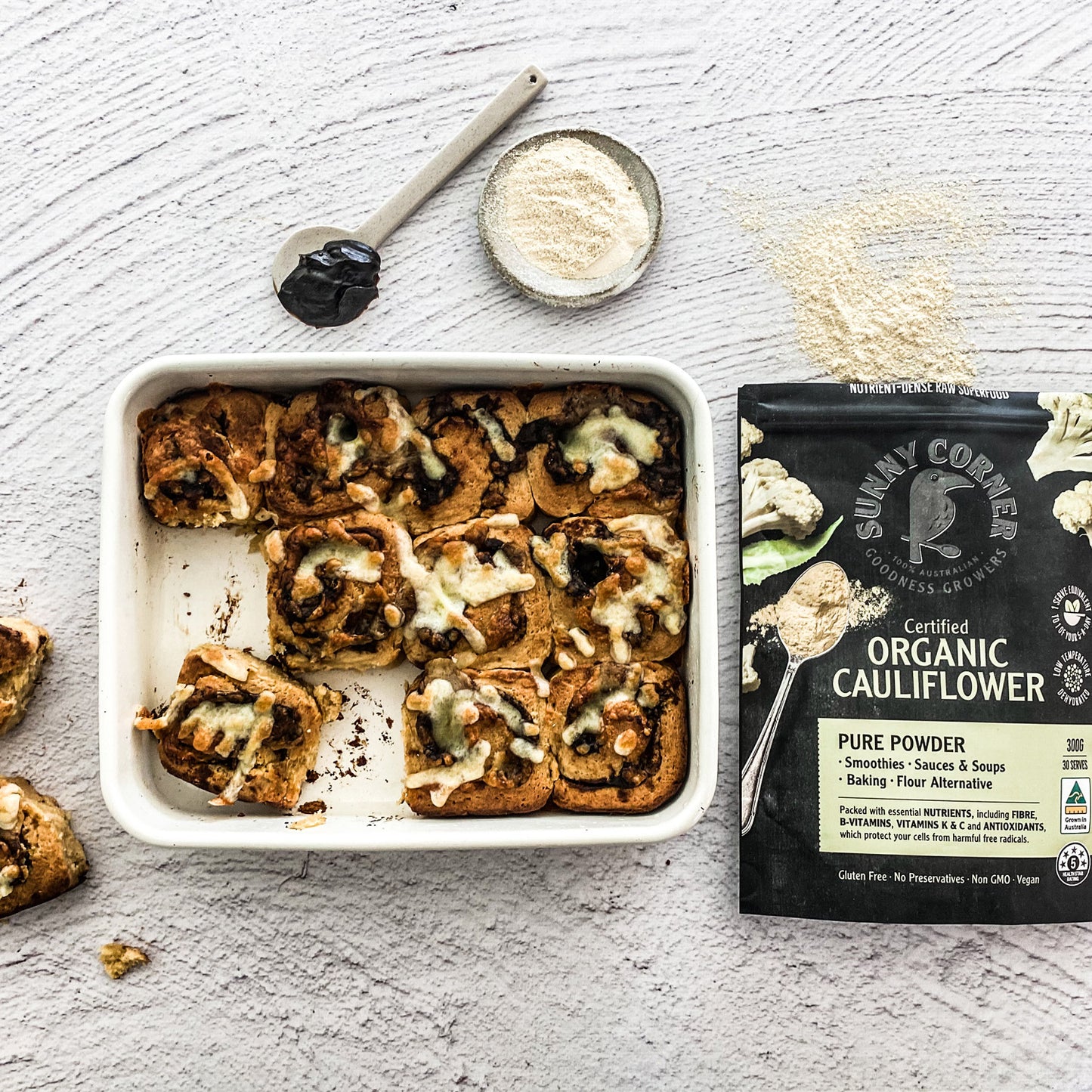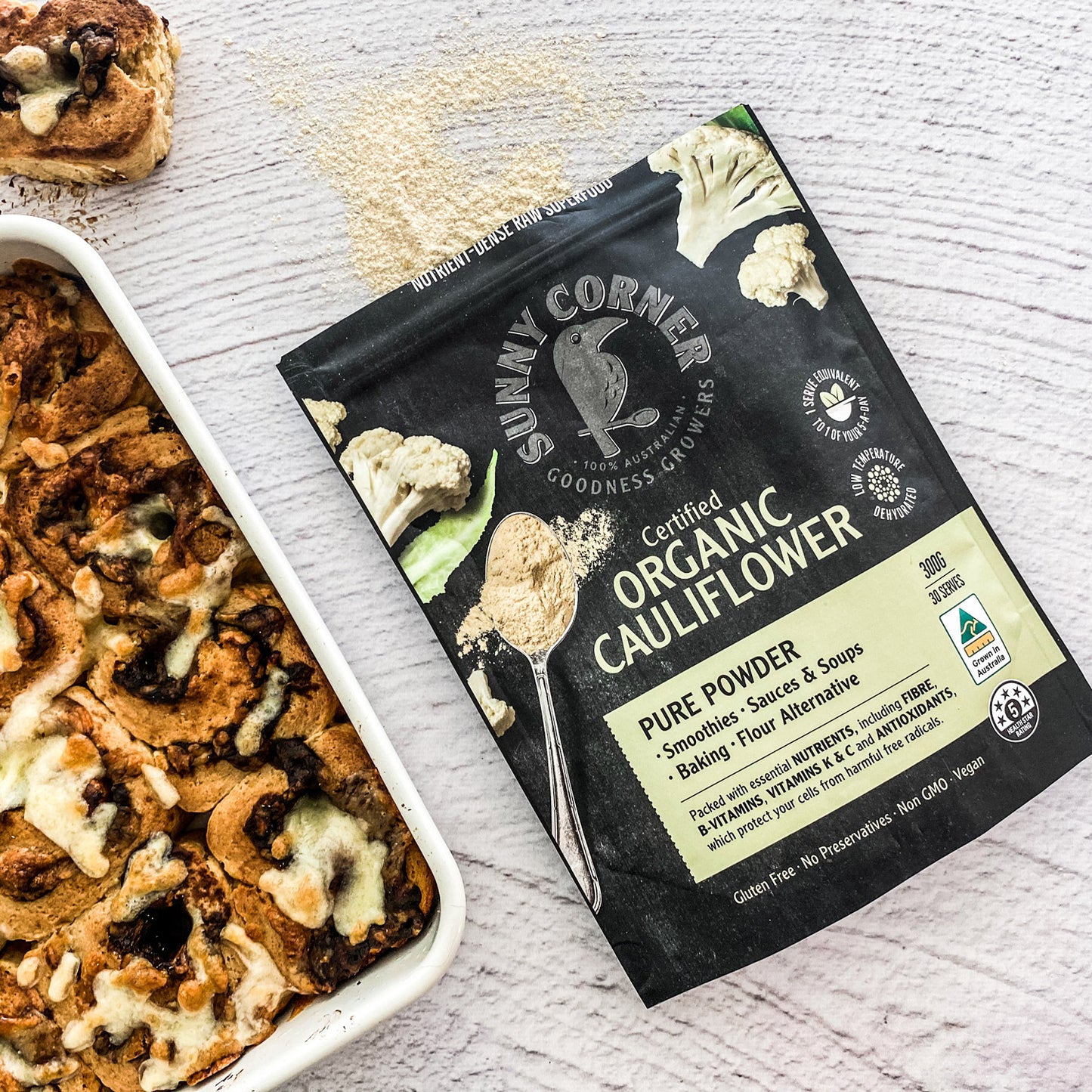 - In a large bowl, mix the flour and cauliflower powder. Add in the butter and squeeze between fingers until all butter is dispersed and mixture appears like bread crumbs.