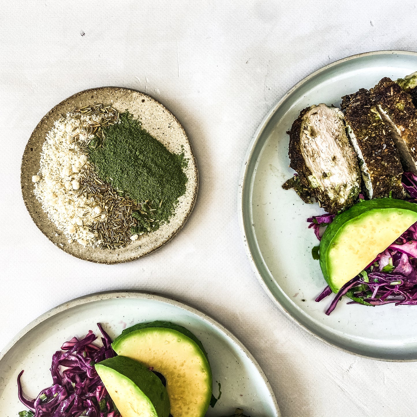 - Combine the kale powder, almond meal, garlic powder, salt and rosemary in a bowl, then spread out on a tray or plate.